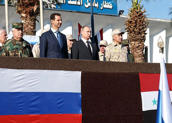 التقى بوتين الرئيس السوري بشار الأسد في قاعدة حميميم التي وصلها في زيارة مفاجئة وكان برفقته وزير الدفاع سيرغي شويغو ورئيس المجموعة العسكرية الروسية في سوريا سيرغي سوروفيكين.