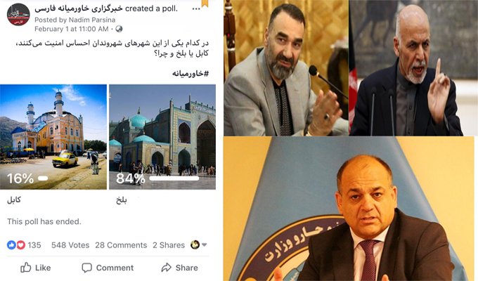 تیره اونۍ خاورې میانه خبري اژانس د بلخ ولایت او دکابل د امینت په تړاو نظر پوښتنه په لاره اچولې وه چې د ټولنیزو شبکو کاروکونکو په کې خپله رایه کارولې ده او ویلي دي چې د افغانستان زیات شمیر اوسیدونکي په بلخ کې د خوندي امنیت احساس کوي .