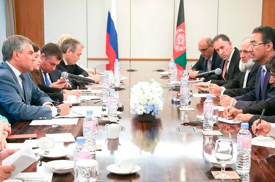 Информационное агентство Средний Восток, спикер нижней палаты парламента Афганистана Рауф Абдул Ибрагим и председатель Государственной думы Вячеслав Володин в Санкт-Петербурге...