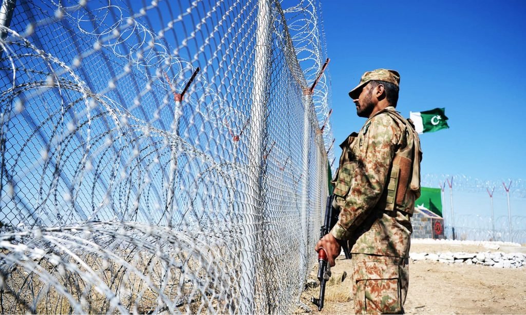 A Pakistani soldier keeps vigil next to a newly fenced border fencing along with Afghan's Paktika province border in Angoor Adda in Pakistan's South Waziristan tribal agency on October 18, 2017. The Pakistan military vowed on October 18 a new border fence and hundreds of forts would help curb militancy, as it showcased efforts aimed at sealing the rugged border with Afghanistan long crossed at will by insurgents. / AFP PHOTO / AAMIR QURESHI