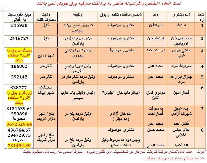 د دې لیست پر بنیاد، د پنجشیر پخوانی ښاروال ،اسدالله ولد میر افغان ۵۱۵۹۳۰ افغانۍ،د کابل د خلکو استازی محمد نور اوریاخیل ۲۴۱۶۷۲۷ افغانۍ،د نیمروز د ولایتي شورا غړی حاجي یونس عرب،د ننګرهار د ولایتي شورا غړی،اسرار الله مراد ۱۸۶۸۰۲ افغانۍ،د ننګرهار د خلکو استازی ابرار الله مراد ۵۹۲۱۴۲ افغانۍ،د یوه سیایسي ګوند رئیس ،فضل الدین ۳۲۸۷۷۷ افغانۍ ، د بلخ د خلکو استازی،فضل احمد ۳۶۷۲۵۲۹ افغانۍ او د بلخ ولایت بل استازی غلام عباس اخلاقي ۷۳۱۴۹۴ افغانۍ د بریښنا شرکت پوروړي دي.